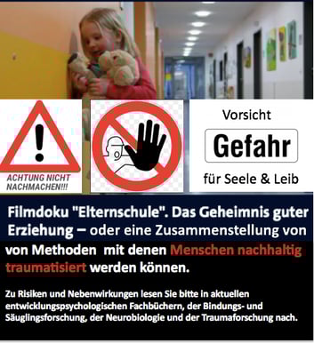Es ist unsäglich, dass diese wesentlichen entwicklungspsychologischen Erkenntnisse, die Forschungsergebnisse aus der Bindungs- und Säuglingsforschung, aus der Neurobiologie und der Trauma- und Therapieforschung an vielen Stellen ignoriert und sogar gegen diese nach wie vor und ganz bewusst agiert wird und dass ein öffentlich rechtlicher Sender dazu beiträgt, dass völlig veraltete und sogar schädliche Methoden weiterhin als "Geheimnis der guten Erziehung" weiter in unserer Gesellschaft verankert und so erhalten werden. NEIN!